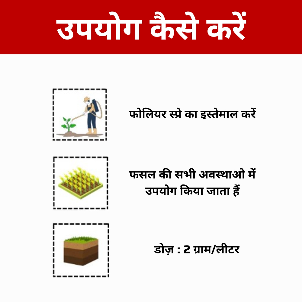 Foliar Spray: 0.5 to 1.0 gm per liter of water. Spray 3-4 times at