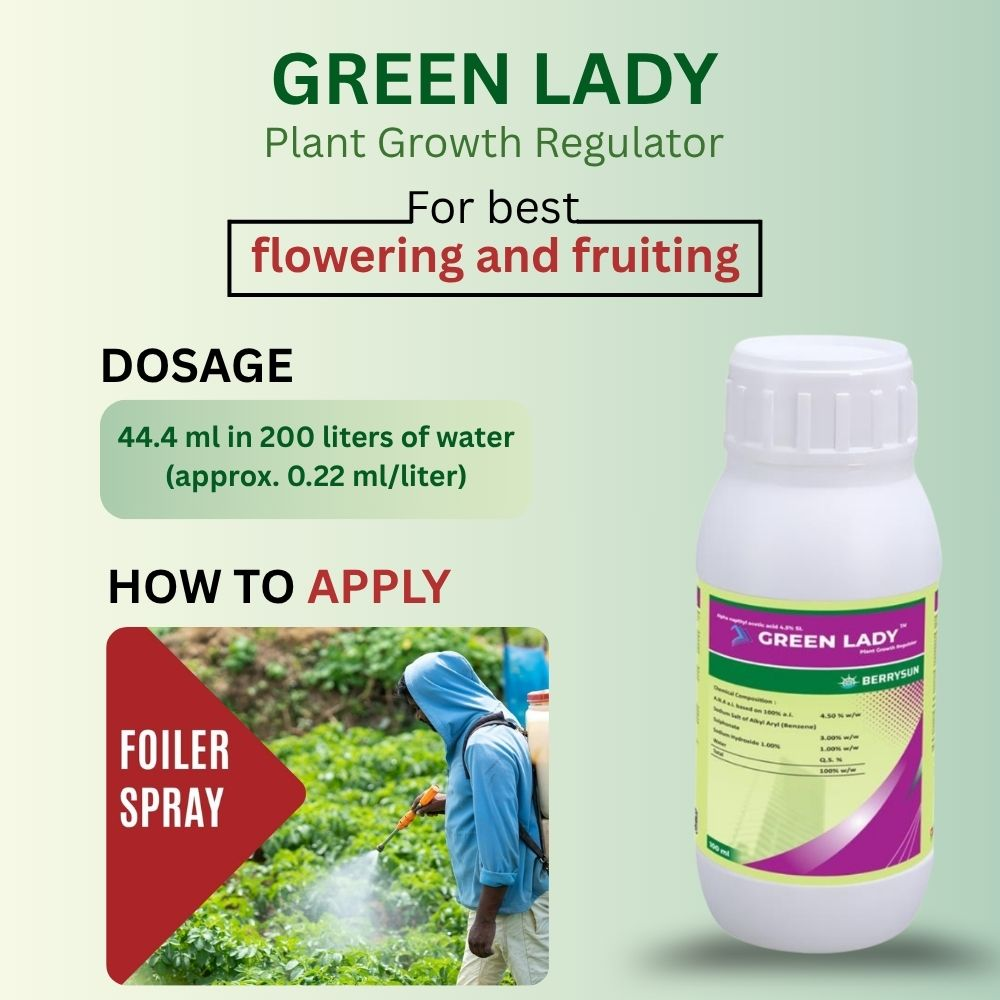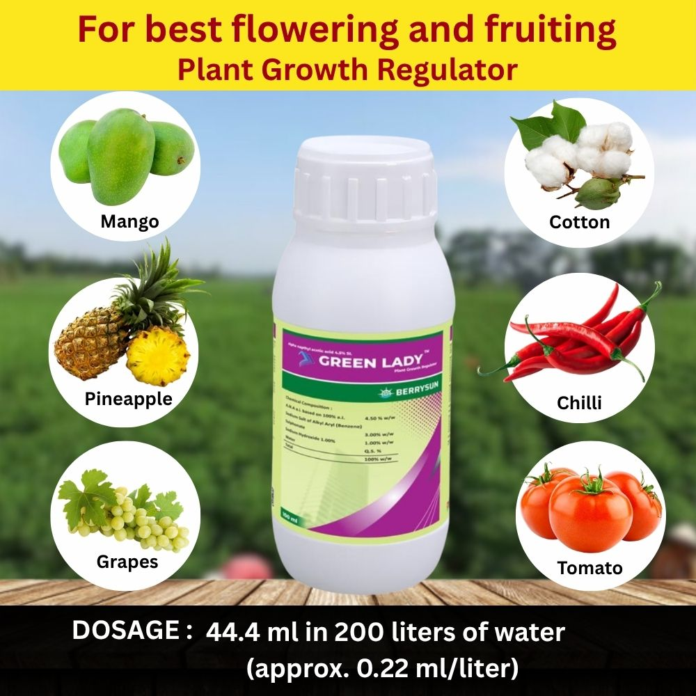 · Green Lady is is a plant growth regulator and it is an aquous, solution containing 4.5% w/w alfa napthyl acetic acid a.i. a plant growth regulator, it is used for the following purpose: