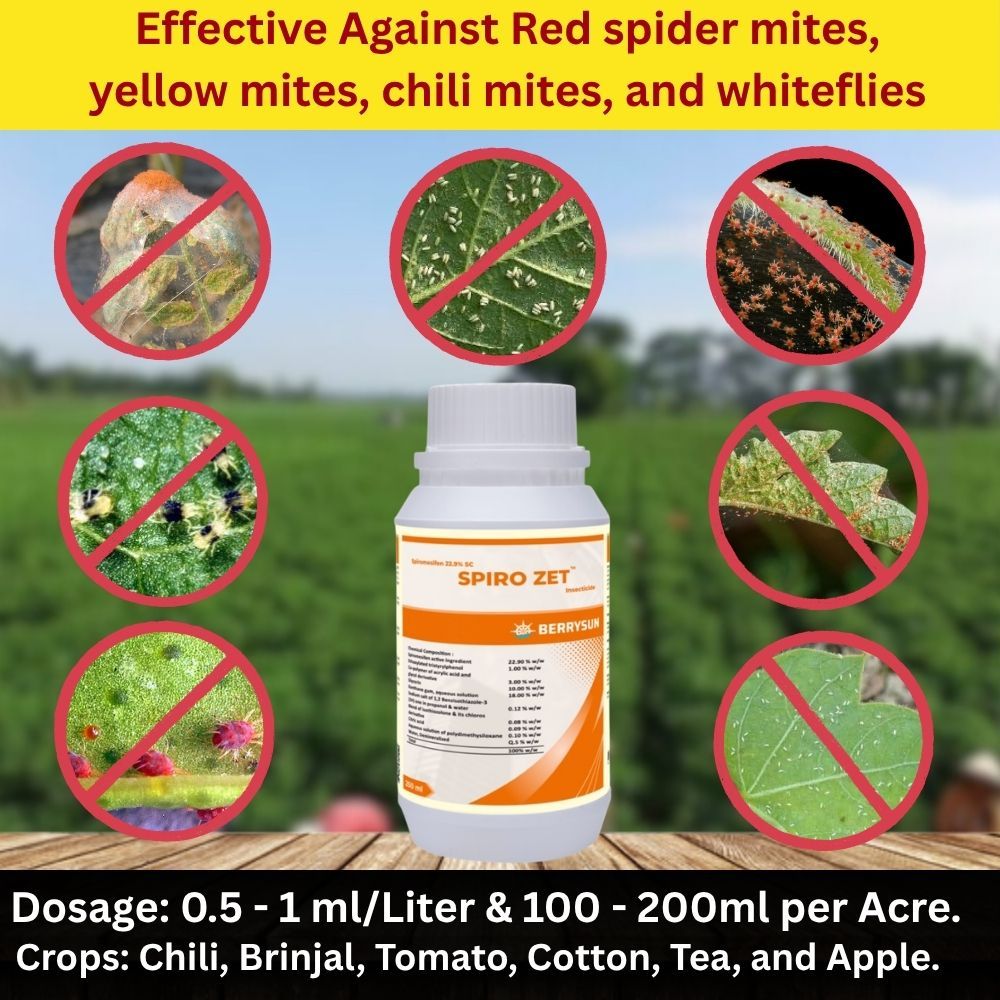 · Mode of Action - The mode of action of SPIRO ZET Insecticide involves direct contact with pests, targeting all developmental stages of mites and whiteflies. It reduces the reproductive capacity of female pests, leading to unhatched eggs through a trans-ovarian effect, and provides long-lasting control with excellent persistence.